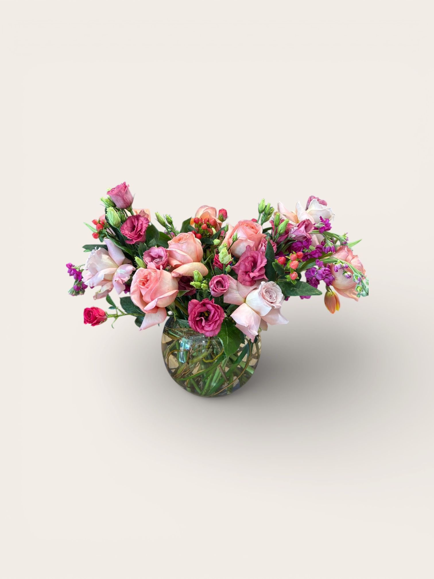 Designed in a clear glass vessel that highlights the natural beauty of the stems, Pink Lemonade feels both relaxed and refined—perfect for kitchen tables, thank-you moments, birthdays, or just because. Sweet, vibrant, and endlessly cheerful, this arrangement is pure happiness in flower form.